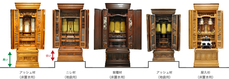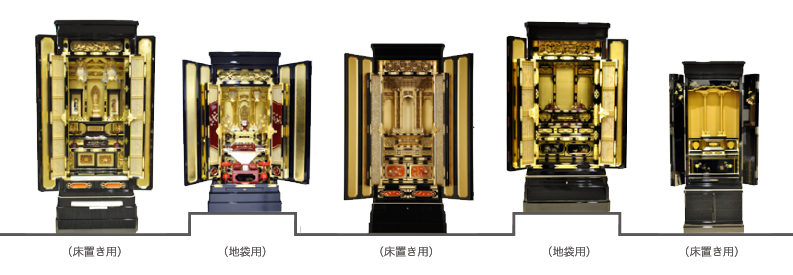 サイズは唐木仏壇同様、床置き用(台付・胴長)と地袋用(別台)に大きく分かれ、